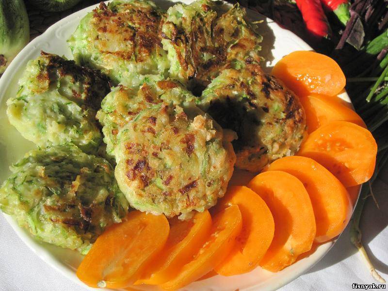 Состав: 1 кг кабачков, 1 стакан муки, соль (желательно морская), специи, подсолнечное масло Способ приготовления на 10 оладьев: 5-6 молодых кабачков с нежной кожицей почистить от плодоножек, натереть на крупной терке. Добавить муку и соль по вкусу. Можно добавить мелко нарезанную зелень и все перемешать. Скатать массу в плотный шарик, уплотняя руками (чтобы мука не прилипала к рукам, смазать их растительным маслом), затем приплюснуть в виде плоской лепешки (чтобы кабачки прожарились). На разогретую на сильном огне сухую сковороду налить подсолнечное масло, выложить оладьи, закрыть крышкой и обжарить с двух сторон, уменьшив температуру до средней.