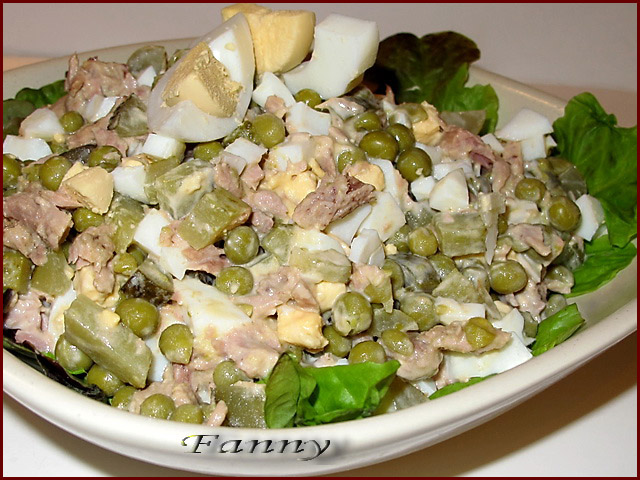 Смешать яйца, огурчики, горошек и тунца. Заправить майонезом.