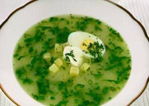 500 г крапивы, 4 яйца, 1 морковь, 300 г картофеля, 1 луковица, 1 ст. ложка рубленой зелени, 80 г топленого масла, 150 г сметаны, соль по вкусу. Лук, морковь и яйца измельчить, положить в кастрюлю, добавить масло, соль и 1 стакан воды. Накрыть крышкой и поставить тушить на небольшой огонь. Когда вода выпарится и останется только масло, влить вместе с отваром отваренную и протертую крапиву, добавить 5—6 тарелок воды, прокипятить 15 мин, затем всыпать очищенный и нарезанный кубиками картофель, подсобить. Варить суп до готовности картофеля. Снять с огня и всыпать рубленую зелень. Подавать суп со сметаной. Примечание. Так же можно приготовить суп из щавеля, шпината или салата.